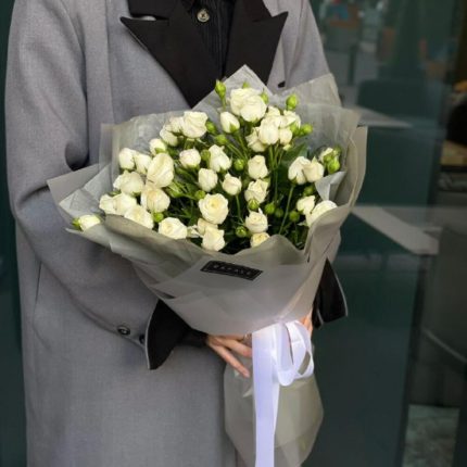 mono bouquet 114 из 7 кустовых пионовидных роз сорта trendsetter с эвкалиптом