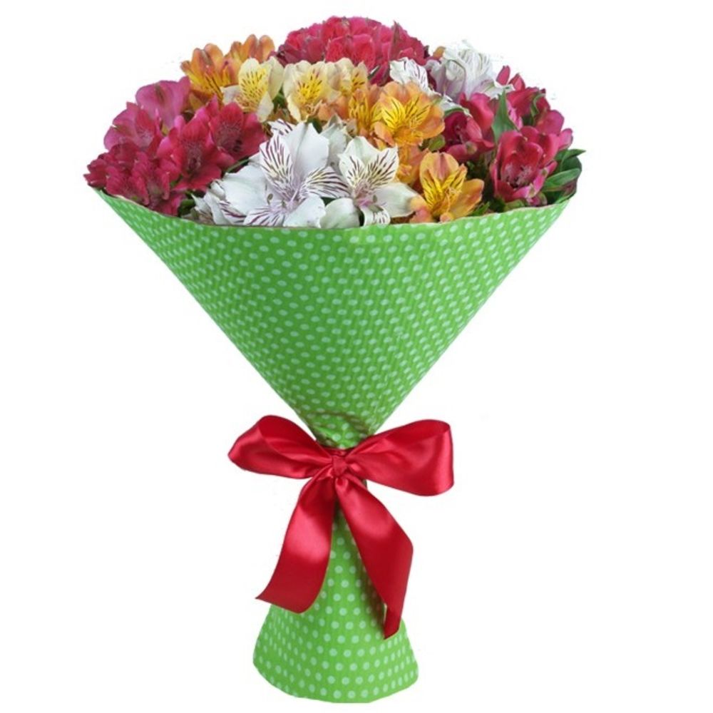лента декоративная – 1 шт.бумага упаковочная – 1 шт.Альстромерия оранжевая – 1 шт.Альстромерия розовая – 2 шт.Альстромерия малиновая – 3 шт.Альстромерия белая – 3 шт.