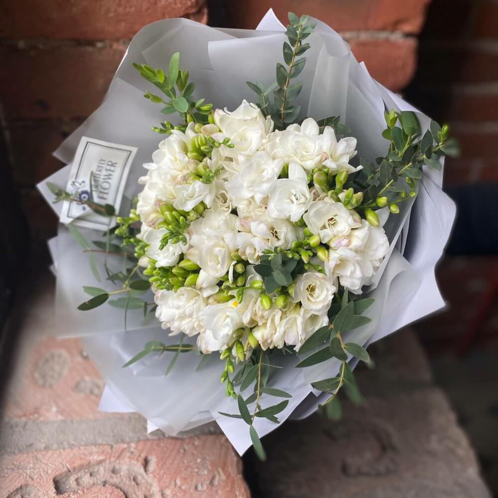Букет из 25 белых фрезий и эвкалипта в стильной упаковке “Мерриам”