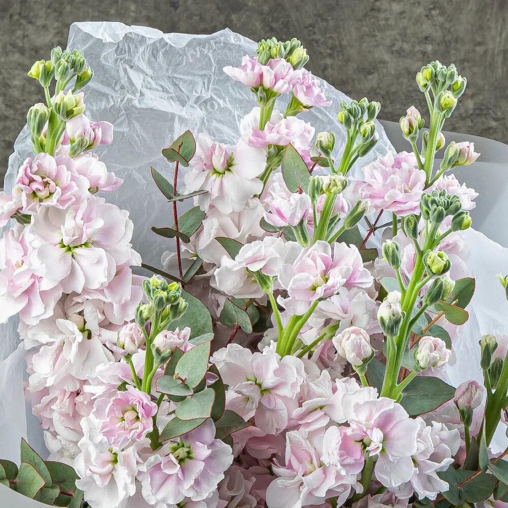 Маттиола лавандовая – 7 шт.Эвкалипт – 2 шт.упаковка подарочная – 3 шт.Средство для продления жизни цветов – 1 шт.