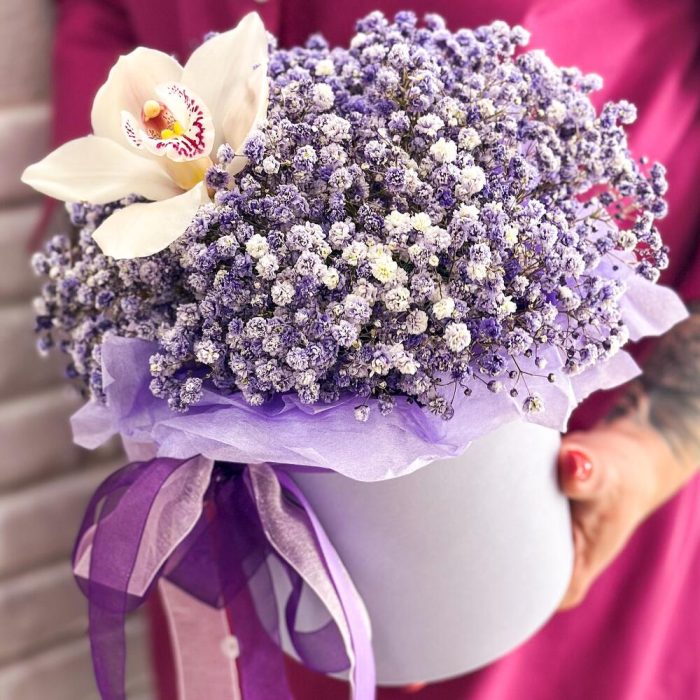 Гипсофила – 7 шт.Орхидея Цимбидиум – 1 шт.Средство для продления жизни цветов – 1 шт.инструкция по уходу за цветами – 1 шт.шляпная коробка с лентами и оазисом – 1 шт.