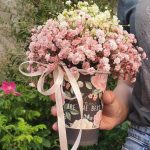 Розовая гипсофила с лавандой и лагурусом в шляпной коробке