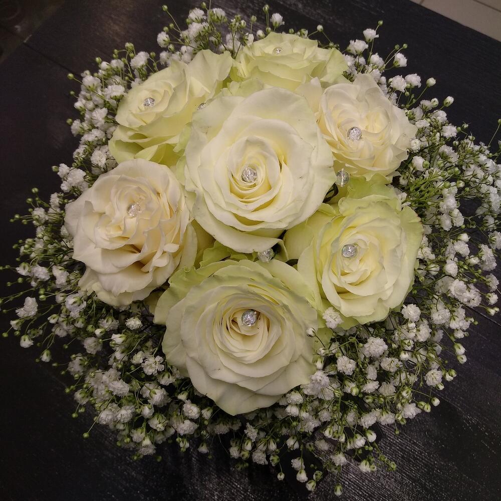 розы мондиаль – 7 шт.гипсофила белая – 4 шт.Лента атласная – 1 шт.бусины – 11 шт.