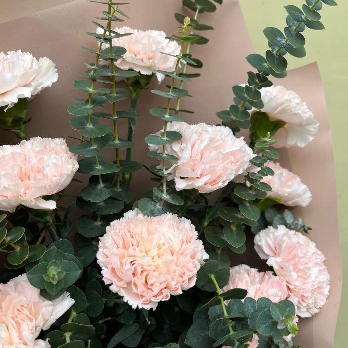 Эвкалипт Baby Blue – 10 шт.Лента атласная кремовая – 1 шт.Упаковка корейская пленка – 1 шт.диантус кремого-розовый – 19 шт.