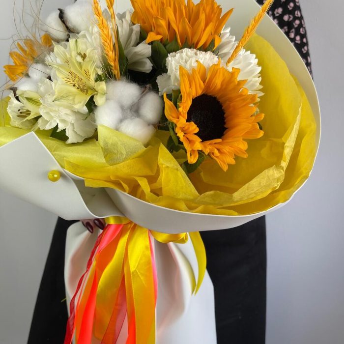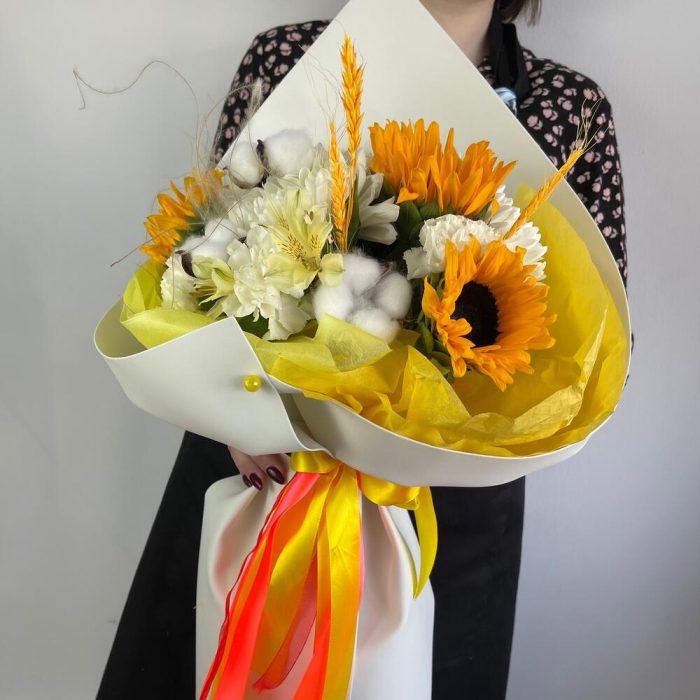 Альстромерия – 1 шт.Хлопок – 3 шт.Лента атласная – 2 шт.Диантус – 3 шт.Подсолнух – 3 шт.Упаковка дизайнерская – 2 шт.Стифа – 1 шт.Пшеница (сухоцвет) – 3 шт.антонов – 3 шт.