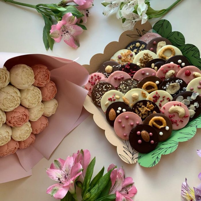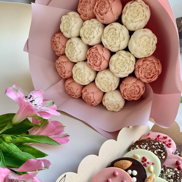 Букет шоколадных пионов и коробка медиантов
