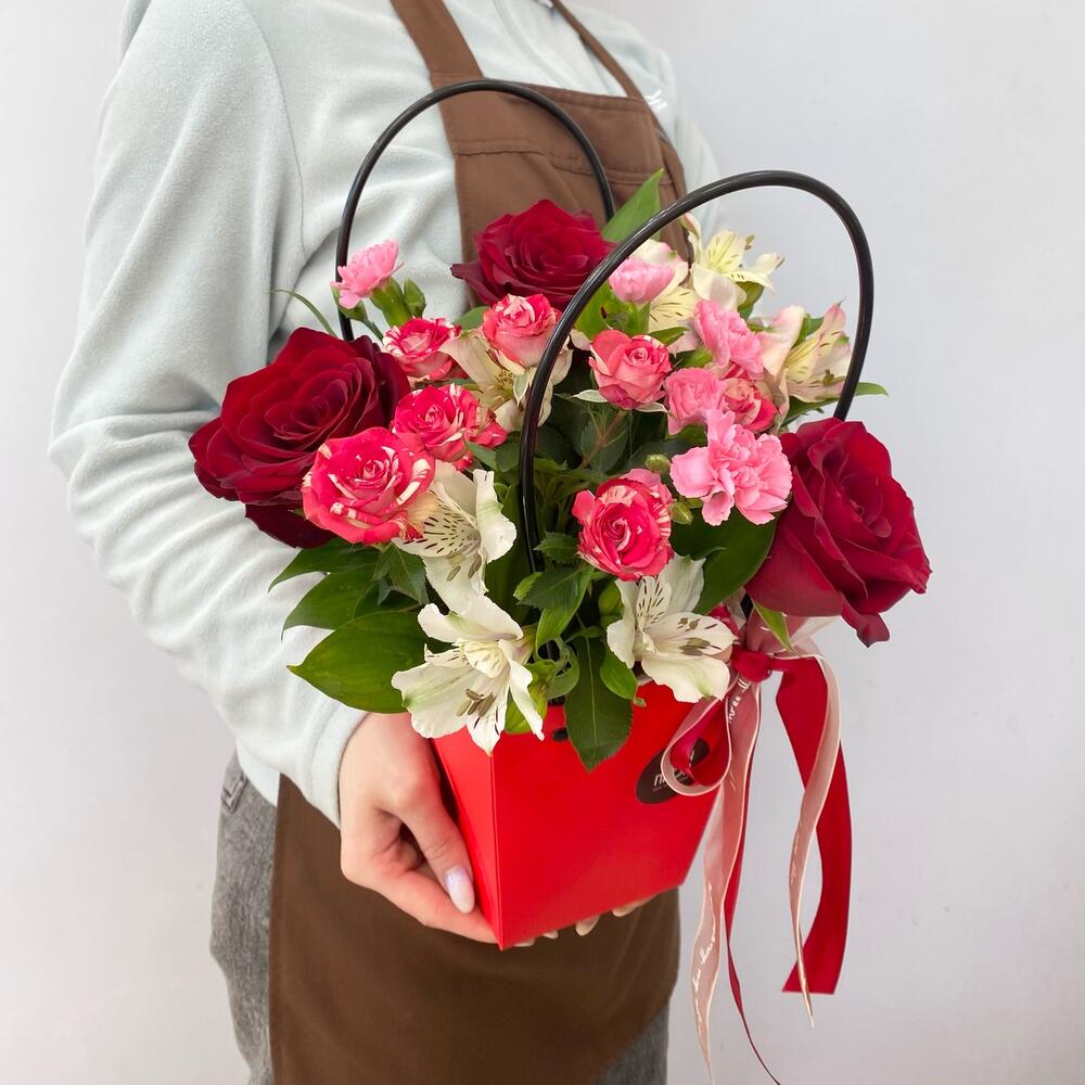 Альстромерия – 2 шт.Рускус – 3 шт.Гвоздика кустовая – 1 шт.Роза Эксплорер – 3 шт.роза фаервокс кустовая – 1 шт.
