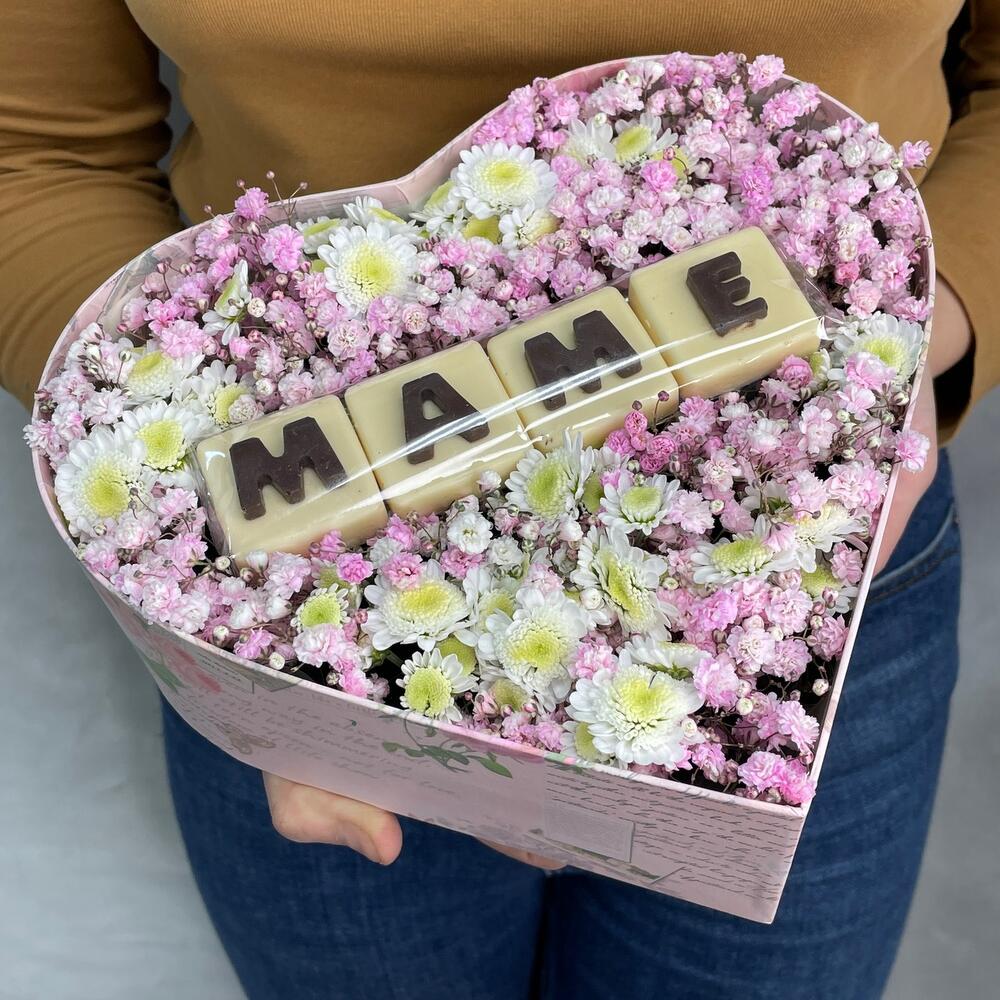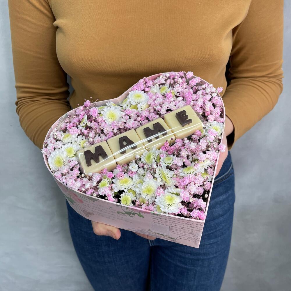 Коробка-сердце – 1 шт.Оазис – 1 шт.Хризантема сталион – 3 шт.Гипсофила розовая – 3 шт.Буквы шоколадные – 4 шт.