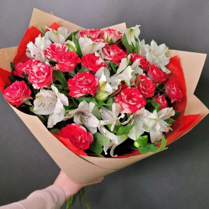 Роза кустовая – 3 шт.Альстромерия Микс Европа – 5 шт.Упаковка дизайнерская – 3 шт.
