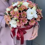 Коробка Марсала из эустомы и хризантемы