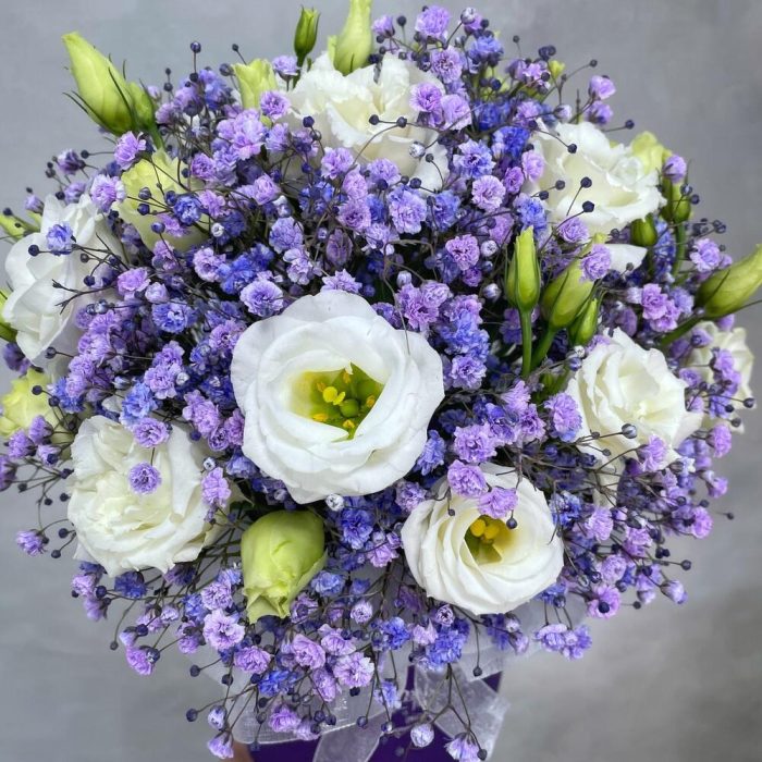 Коробочка с лизиантусами и гипсофилой