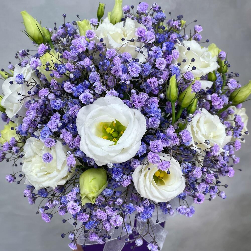 Гипсофила – 7 шт.Лизиантус – 5 шт.Оазис – 1 шт.Коробка d12 – 1 шт.