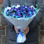 Букет из синих орхидей Космос в руках. Букет 240 ALMOND ROSES