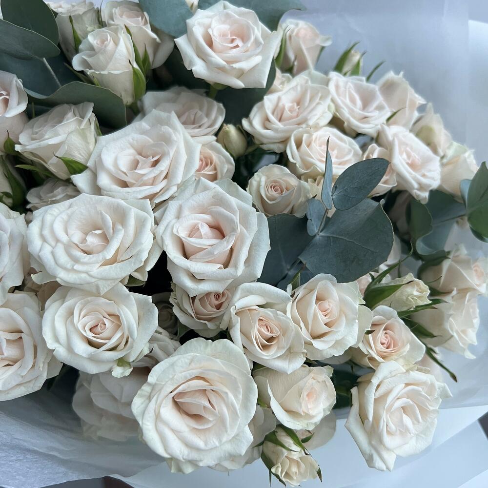 Роза кустовая – 15 шт.Эвкалипт – 3 шт.Упаковка дизайнерская – 2 шт.