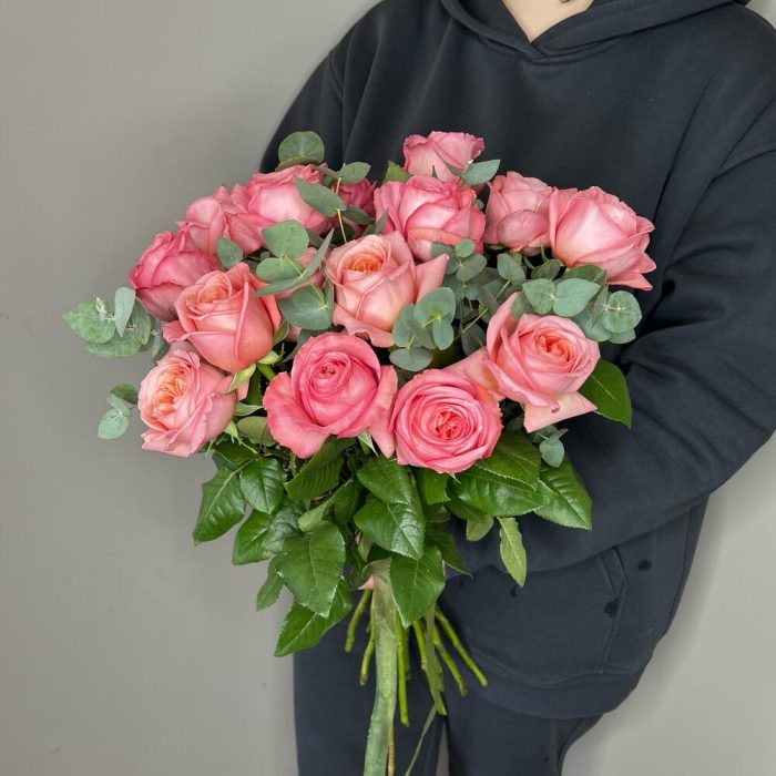 Эвкалипт – 2 шт.Роза пионовидная – 15 шт.комплимент от polyanka – 1 шт.