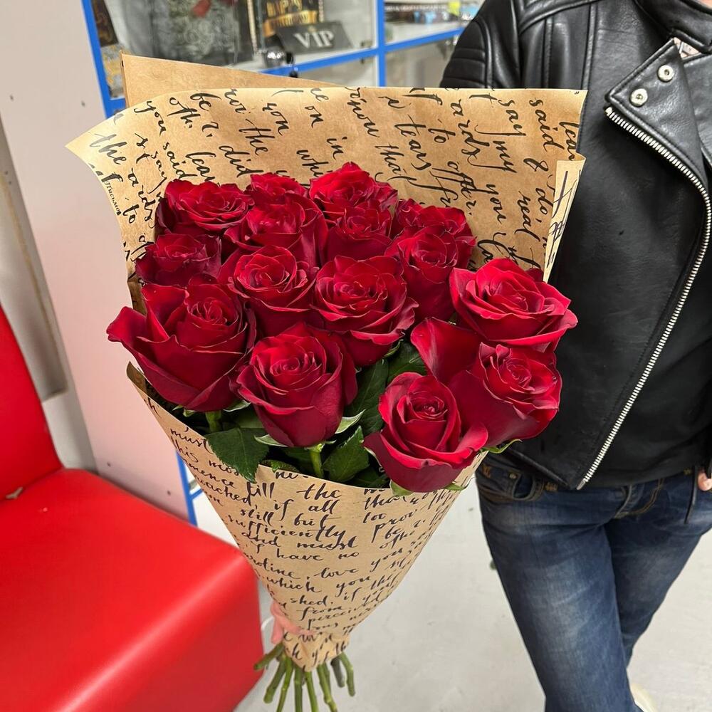 розы эквадор (60 см) – 15 шт.Лента атласная – 1 шт.Крафт – 1 шт.