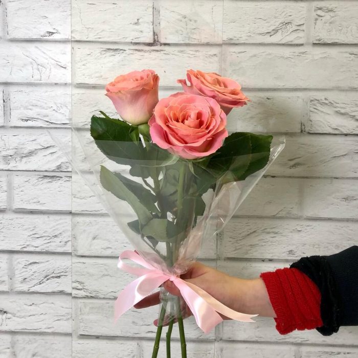 Упаковка – 1 шт.Лента атласная – 1 шт.Роза нежно розовая – 3 шт.