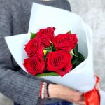 Роза красная 60 см – 5 шт.Упаковка – 1 шт.Лента – 1 шт.