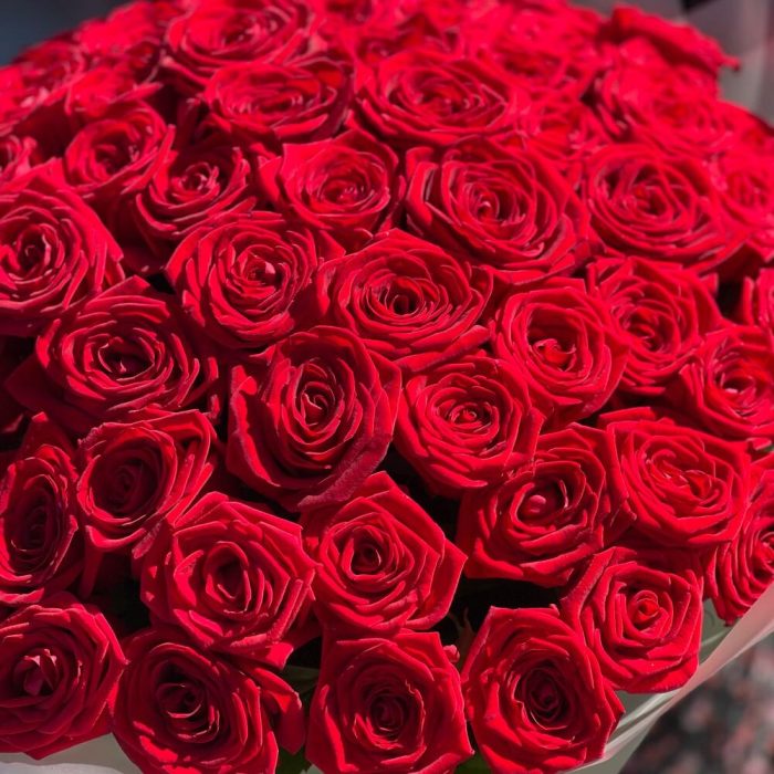 Роза красная 60 см – 75 шт.Упаковка дизайнерская – 4 шт.Открыточка с вашими пожеланиями – 1 шт.подкормка для срезанных цветов – 1 шт.