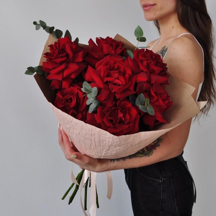 Бархатные французские розы с эвкалиптом, 7 штучек