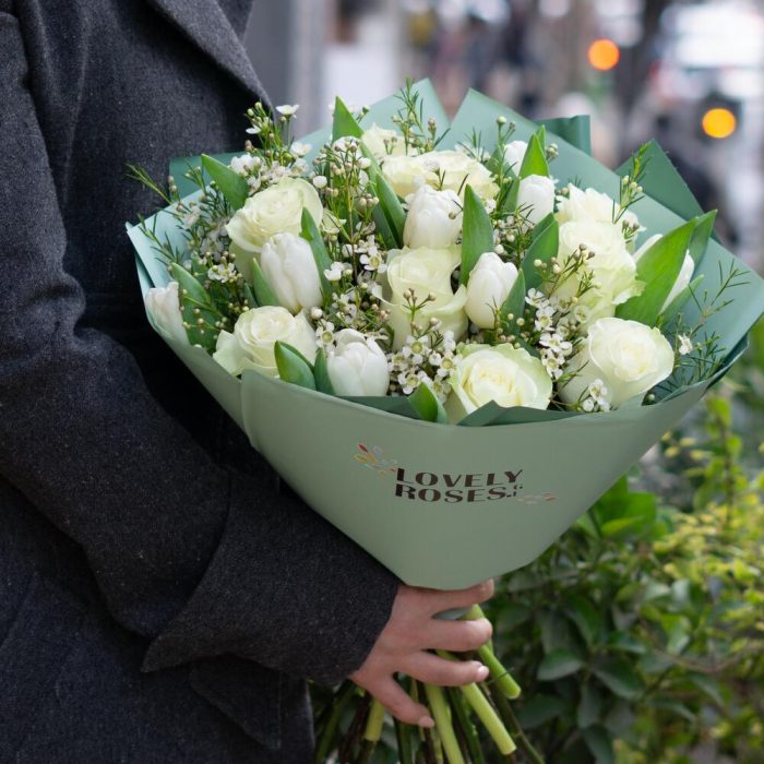 Корзина с белыми розами, лилиями и альстромериями «Весенний сад»