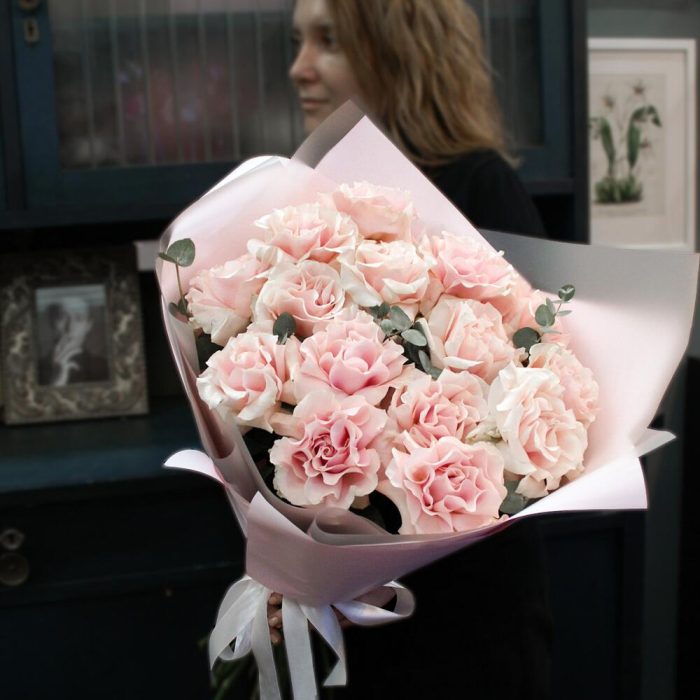 Эвкалипт – 2 шт.Атласная лента – 2 шт.Французская роза – 15 шт.Матовая пленка – 3 шт.