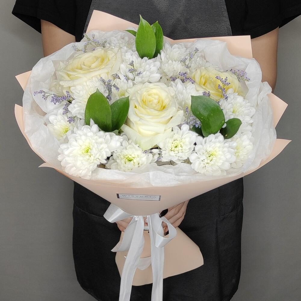 Букет ароматных роз, хризантемы и лилового лимониума “Нежность”