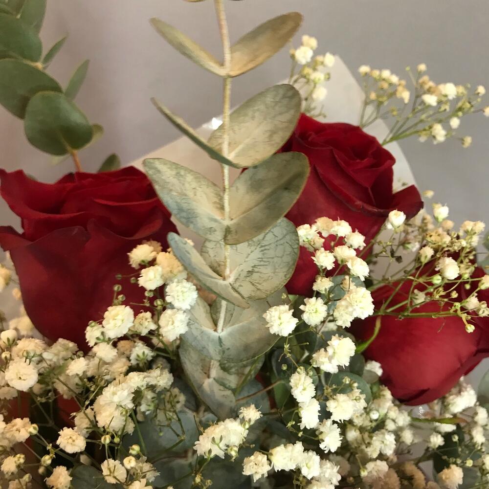 Роза – 5 шт.Эвкалипт – 1 шт.Гипсофила – 2 шт.Упаковка дизайнерская – 1 шт.Лента атласная – 1 шт.