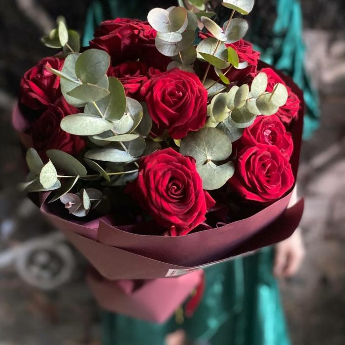 Букет из 13 красных роз и эвкалипта в стильной упаковке “Бордовый нуар”