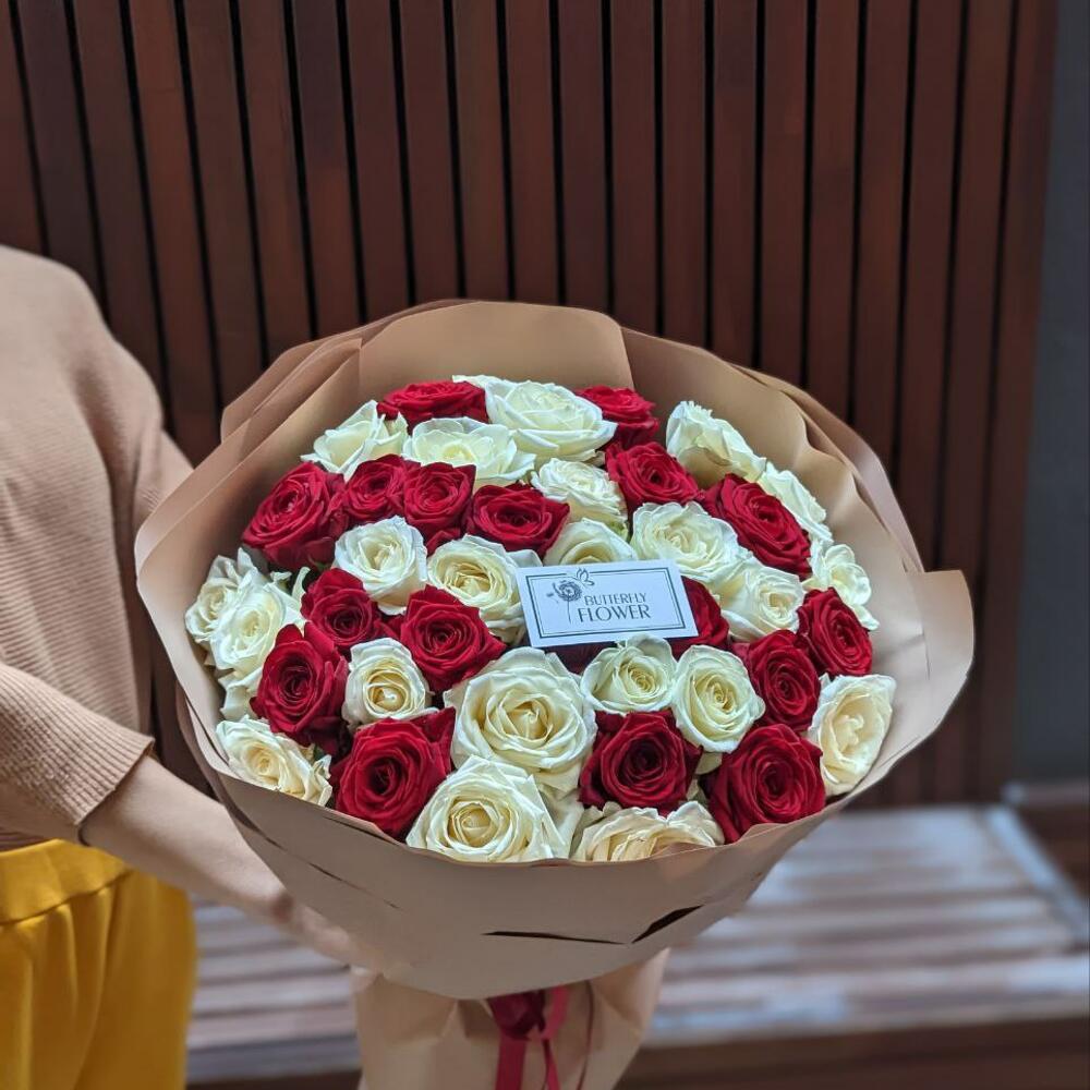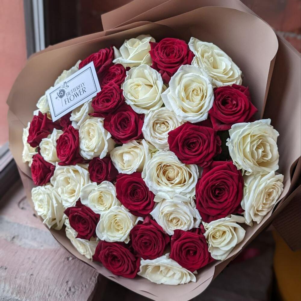Букет из 41 красной и белой розы в стильной упаковке “Красно-белое боке”