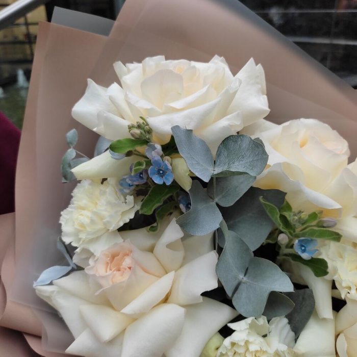 роза вайт о хара( ароматная) – 5 шт.оксипеталум голубой – 3 шт.Диантус белый – 3 шт.Эвкалипт – 1 шт.