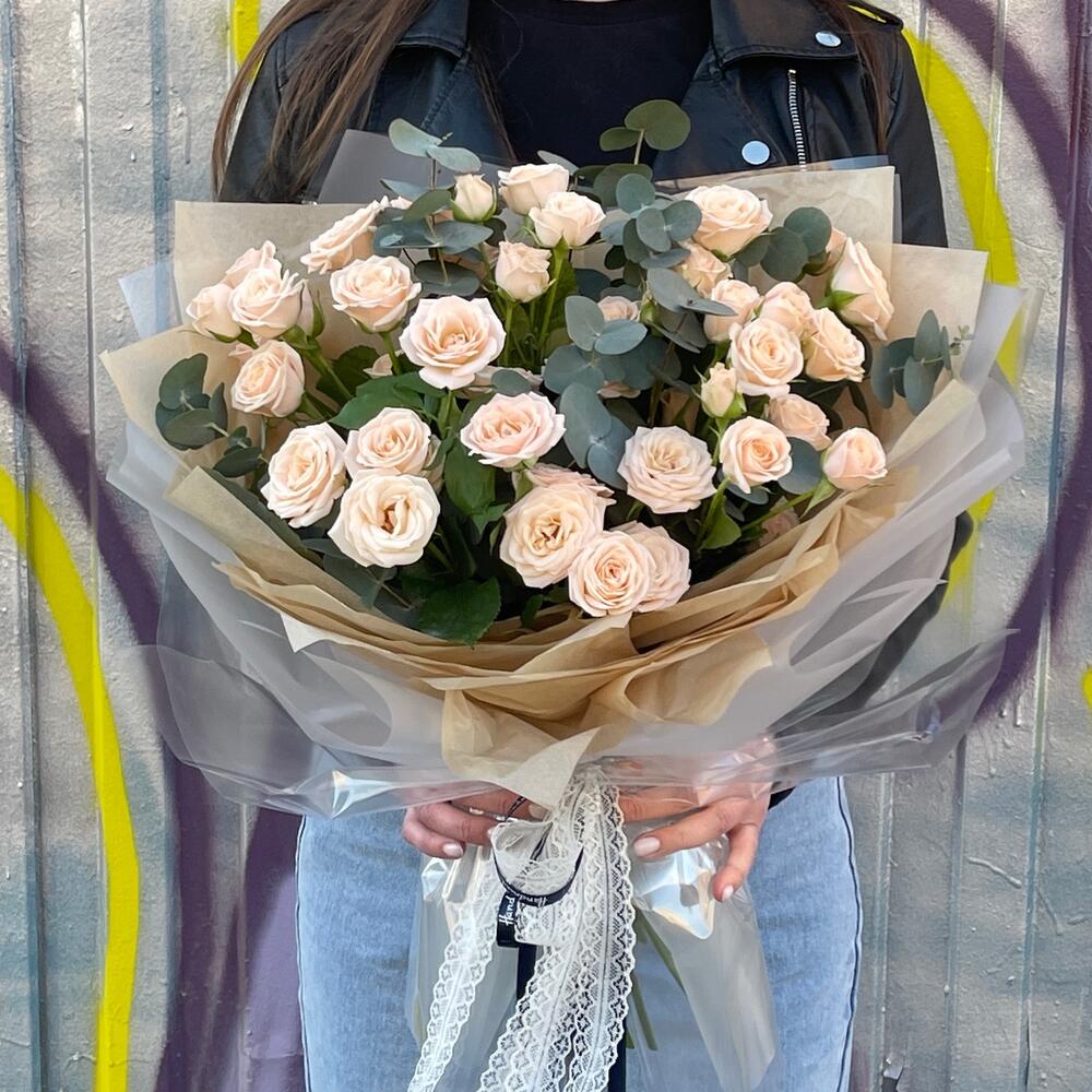 Эвкалипт – 2 шт.Кустовая роза – 11 шт.Лента атласная – 2 шт.Упаковка дизайнерская – 2 шт.