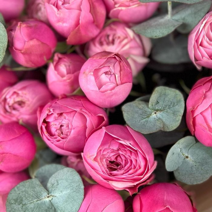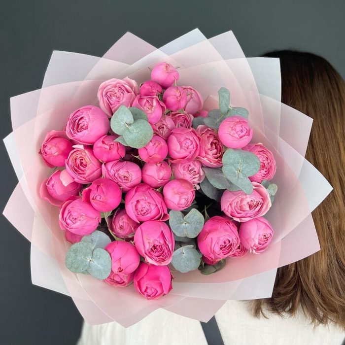 Эвкалипт – 5 шт.Лента атласная – 1 шт.Роза кустовая пионовидная – 7 шт.бумага дизайнерская – 5 шт.