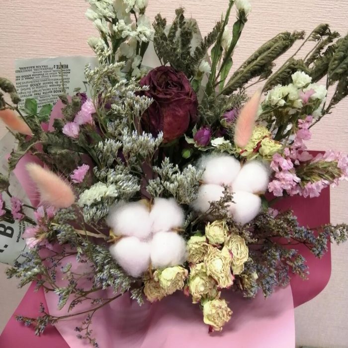 Статица – 3 шт.Хлопок – 2 шт.Колосья – 3 шт.Лимониум – 2 шт.Роза – 1 шт.Роза кустовая – 2 шт.Упаковка – 1 шт.