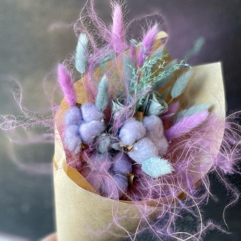 Хлопок – 3 шт.Лагурус – 17 шт.ковыль (пучок) – 3 шт.Крафт – 1 шт.роза стабилизированная пионовидная – 3 шт.