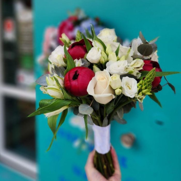 Альстромерия – 5 шт.Лизиантус – 4 шт.Пион – 3 шт.Эвкалипт – 2 шт.Орнитогалум – 3 шт.Эквадор роза – 3 шт.