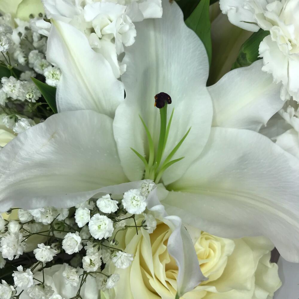 Лилия белая – 1 шт.Роза – 3 шт.Диантус – 5 шт.Гипсофила – 2 шт.Упаковка дизайнерская – 2 шт.