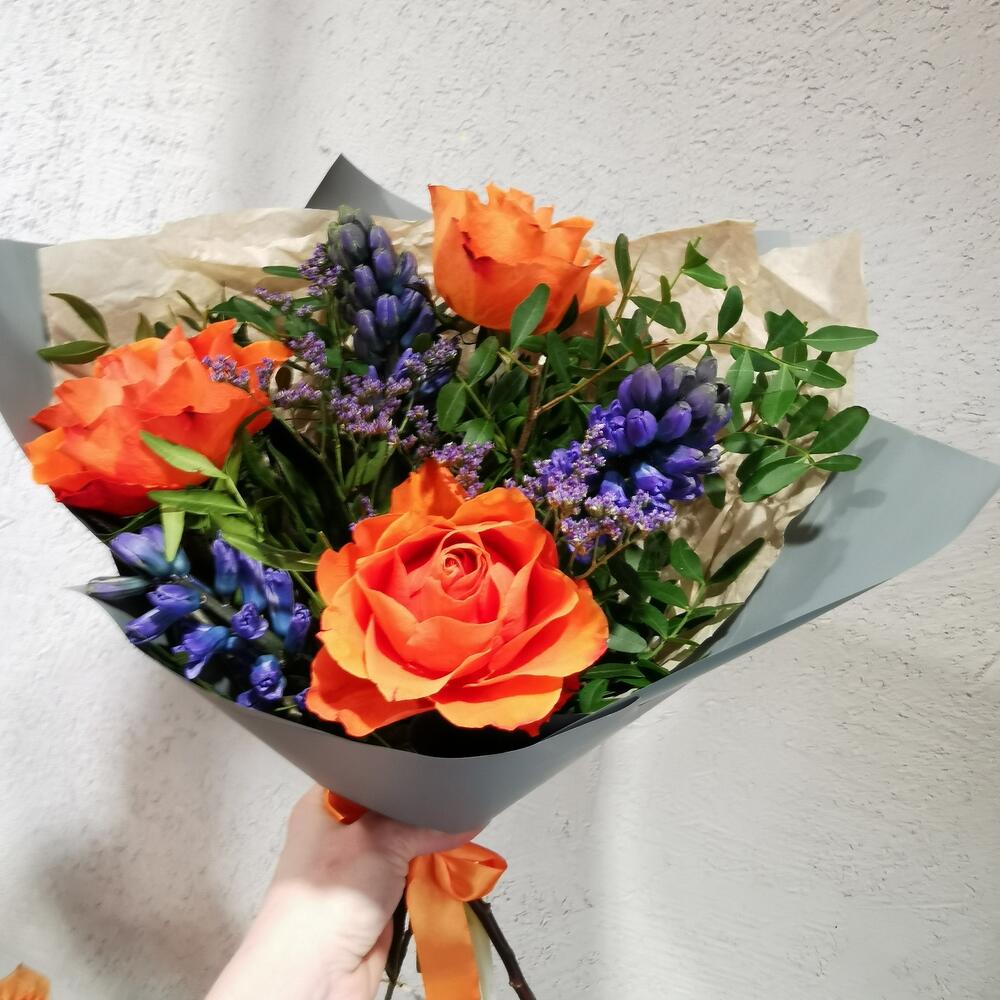 Лимониум – 1 шт.Лента атласная – 1 шт.Фисташка – 10 шт.Упаковка дизайнерская – 1 шт.Роза оранжевая – 3 шт.Гиацинт синий – 3 шт.