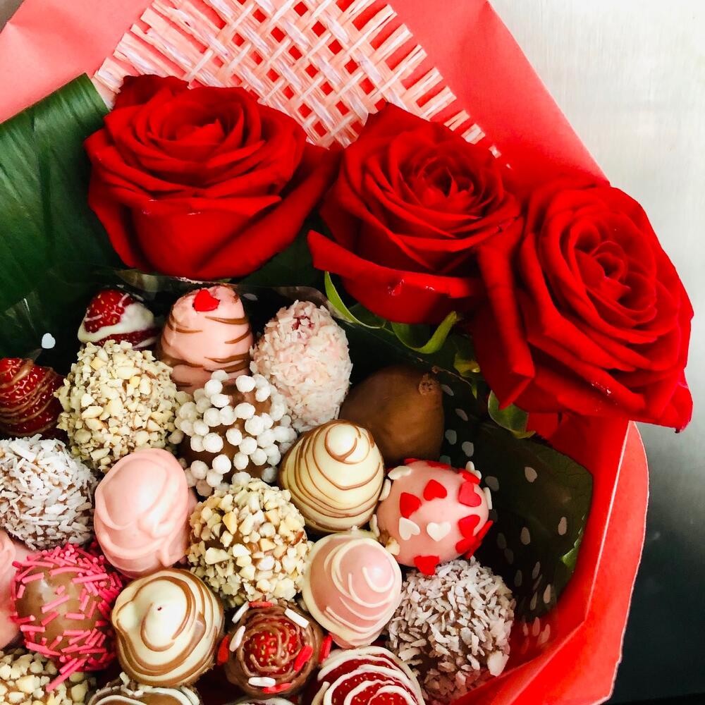 Аспидистра – 1 шт.Роза – 3 шт.Упаковка дизайнерская – 1 шт.Клубника в шоколаде – 500 гр.