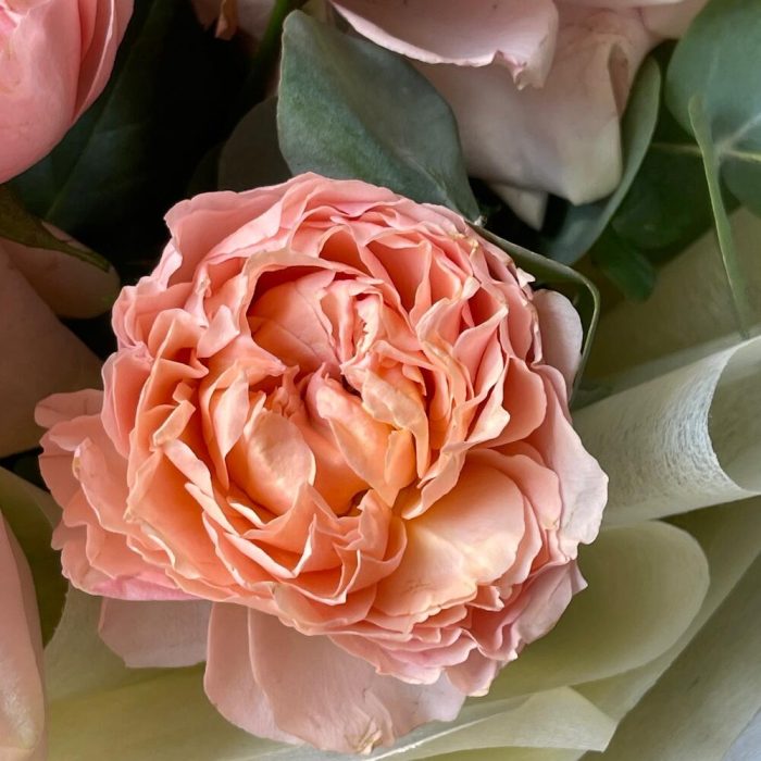 Лента – 1 шт.Маттиола – 1 шт.Роза кустовая – 1 шт.Эвкалипт – 1 шт.Роза одноголовая – 3 шт.Гвоздика – 3 шт.Упаковка дизайнерская – 1 шт.