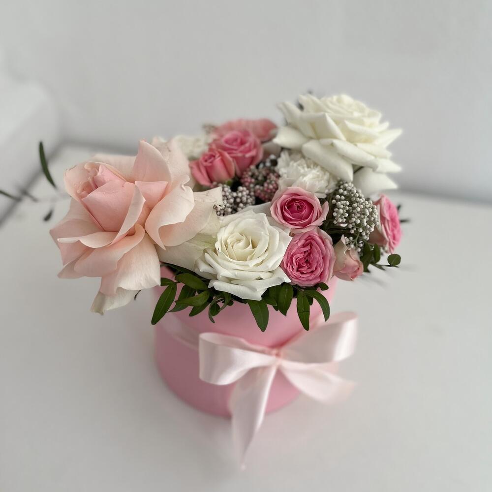 Кустовая роза – 2 шт.Зелень – 5 шт.Лента атласная – 1 шт.Роза белая – 2 шт.Шляпная коробка – 1 шт.Флористическая губка – 1 шт.Открыточка с вашими пожеланиями – 1 шт.Диантус белый – 1 шт.Диантус розовый – 1 шт.зелень экзотика – 3 шт.роза ажурная белая – 1 шт.роза ажурная нежно розовая – 1 шт.