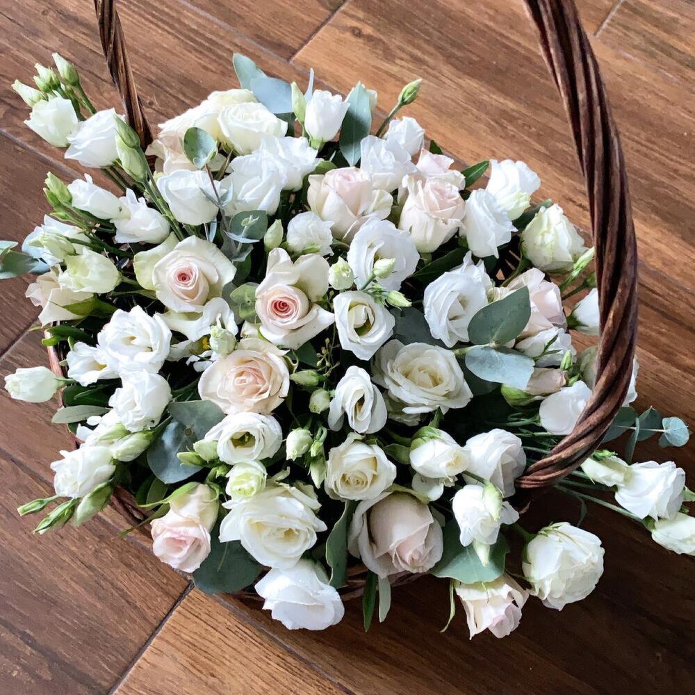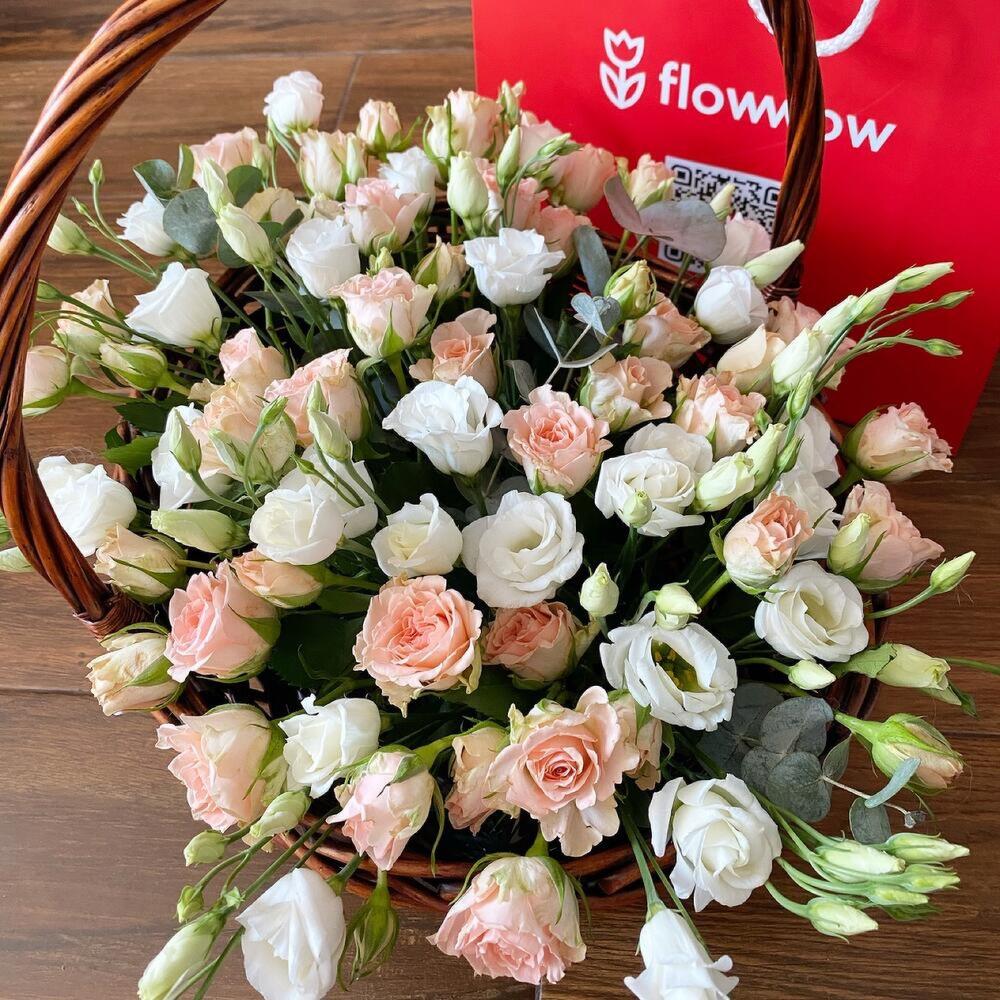 Лизиантус – 10 шт.Роза кустовая – 15 шт.Зелень – 5 шт.Оазис флористический – 1 шт.