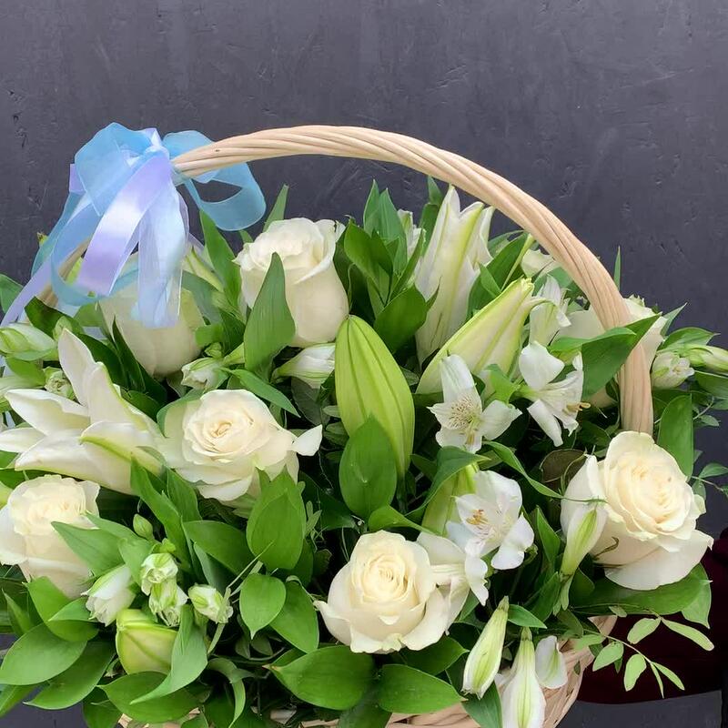Корзина с белыми розами, лилиями и альстромериями «Весенний сад»