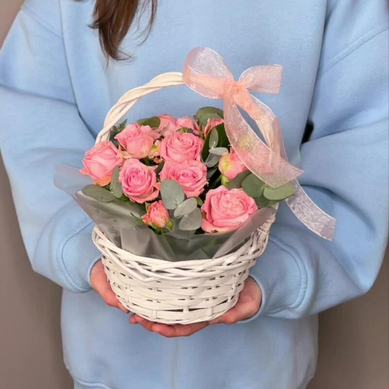 Роза кустовая пионовидная – 4 шт.Корзина плетеная – 1 шт.комплимент от polyanka – 1 шт.
