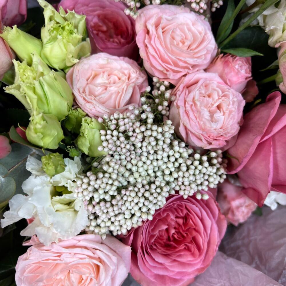Гиперикум – 3 шт.Лизиантус – 2 шт.Маттиола – 3 шт.Озотамнус – 2 шт.Эвкалипт – 2 шт.Фисташка – 2 шт.Роза пионовидная – 7 шт.Роза кустовая пионовидная – 4 шт.Дизайнерская упаковка – 1 шт.комплимент от polyanka – 1 шт.