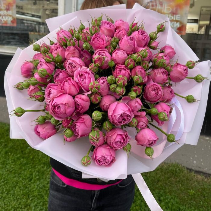 упаковка дизайнерская пленка – 5 шт.бант атласный двойной – 1 шт.пионовидная роза кустовая Misty Bubbles – 19 шт.