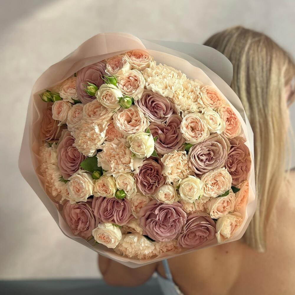 Авторский букет собран из кустовой пионовидной розы, а также эксклюзивного сорта пионовидной одноголосой розы в дополнение с молочными диантусами в декоративной упаковке.