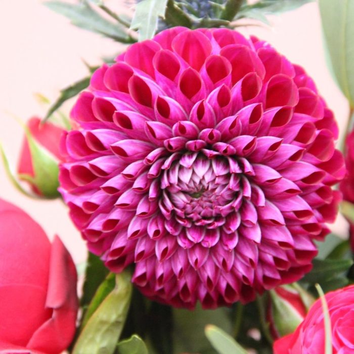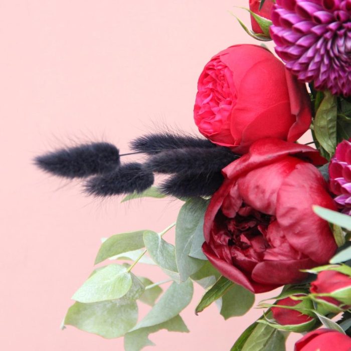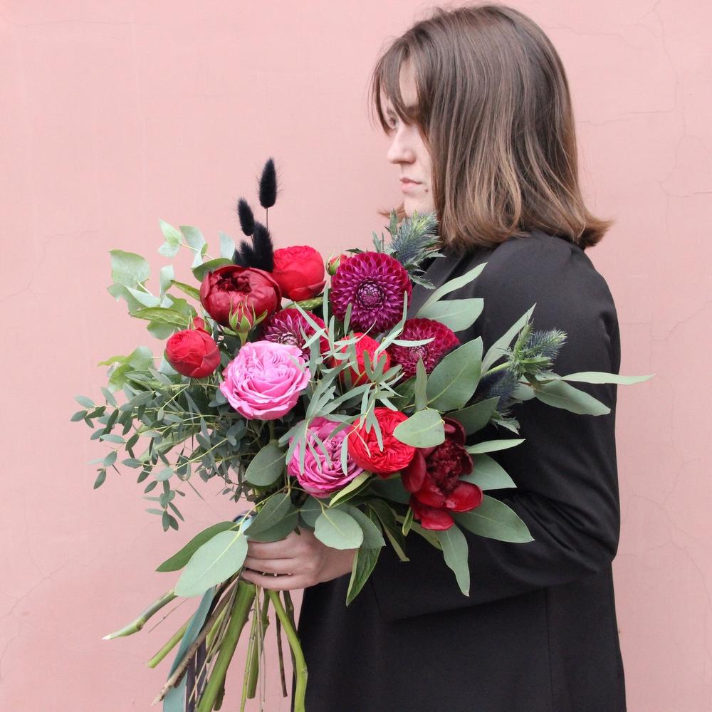 Пион – 2 шт.Роза пионовидная – 6 шт.Георгина – 3 шт.Эрингиум – 2 шт.Лагурус – 10 шт.Эвкалипт – 10 шт.Лента атласная – 2 шт.