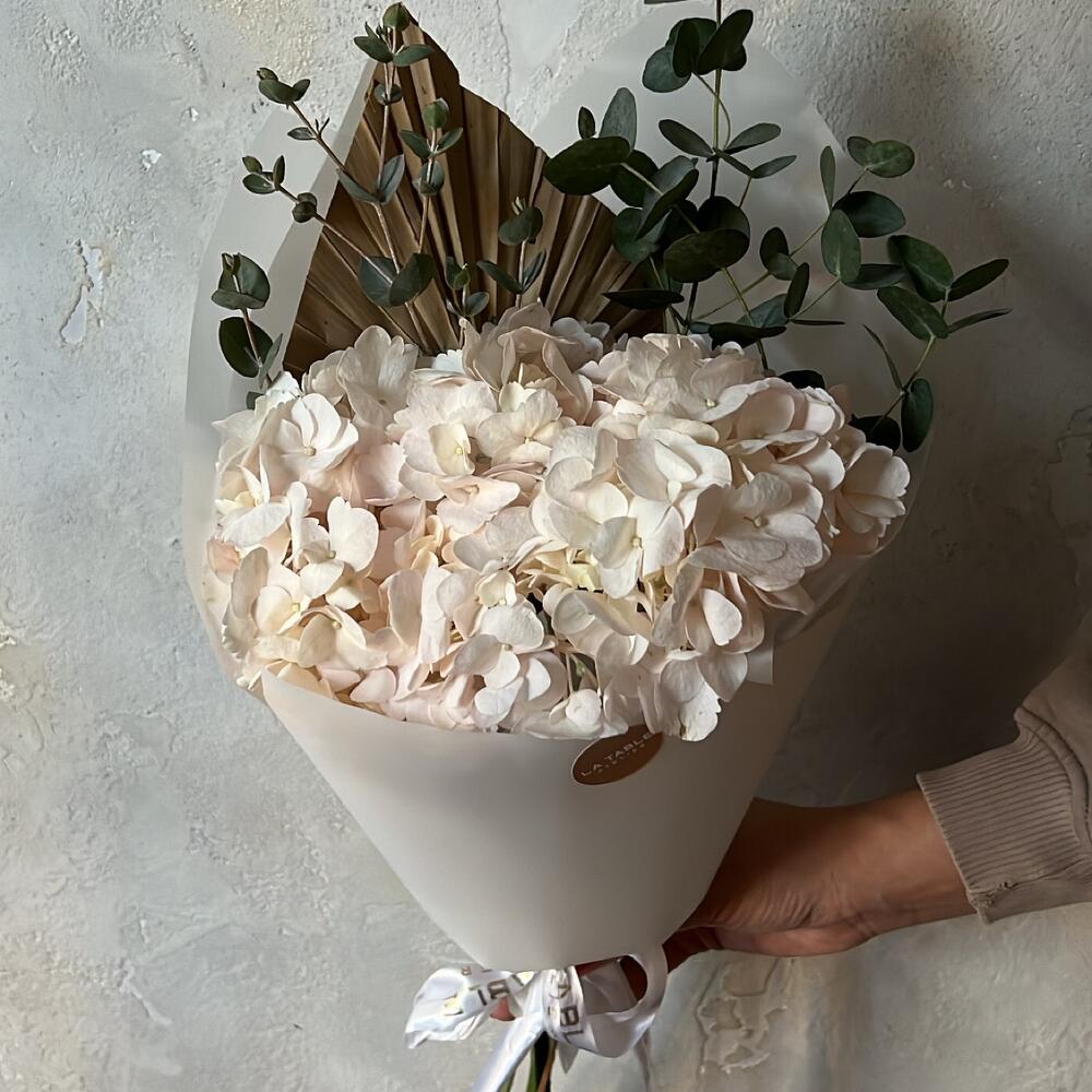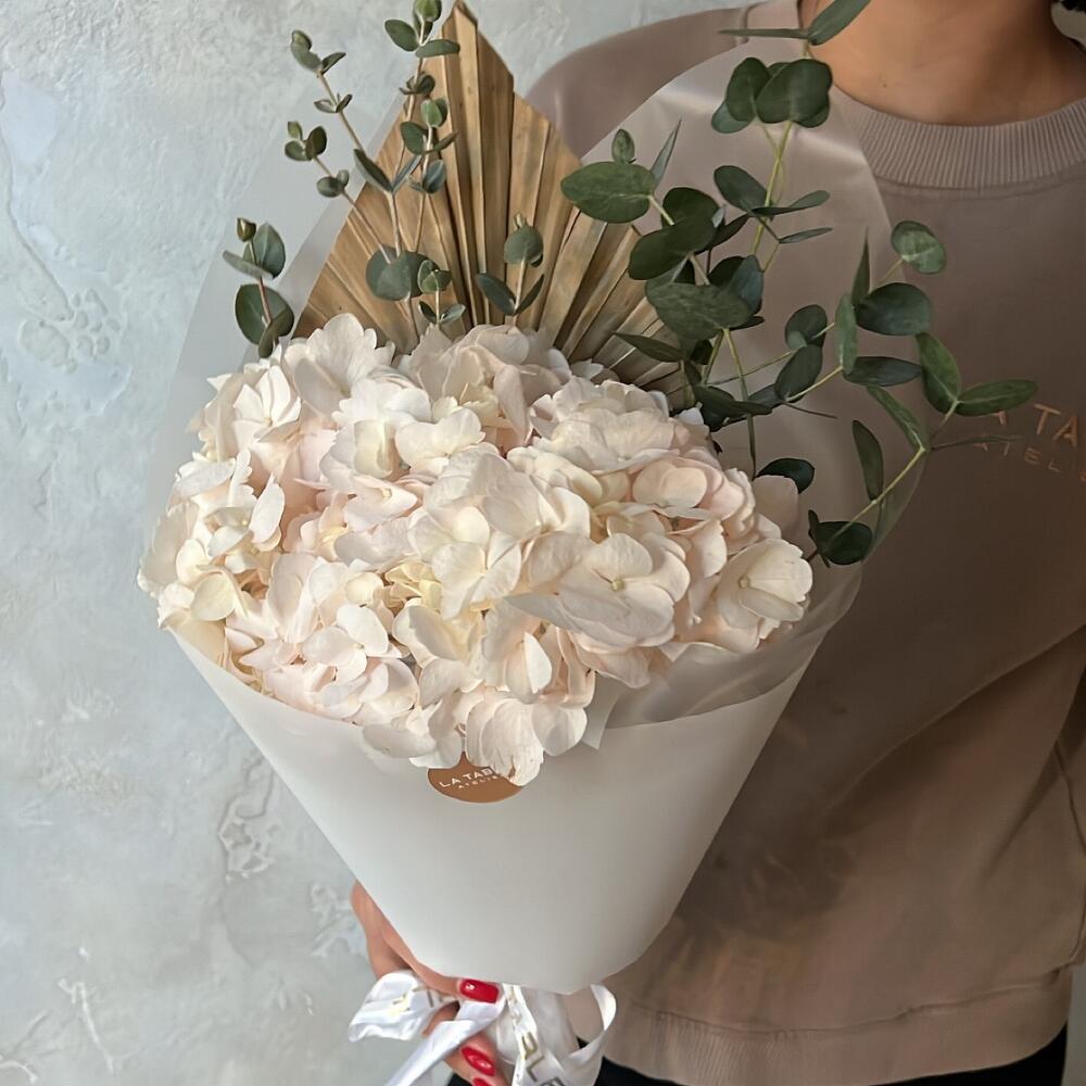 Гортензия розовая – 1 шт.Эвкалипт – 1 шт.Сухоцвет – 1 шт.Упаковка дизайнерская – 1 шт.